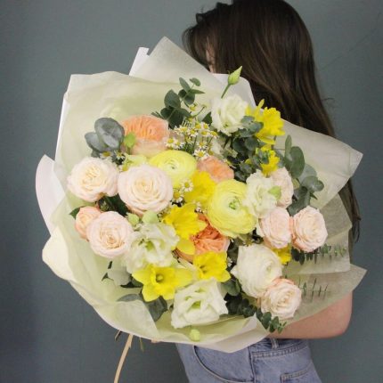 Солнце в руках, букет с ранункулюсами, ромашками и пионовидными розами