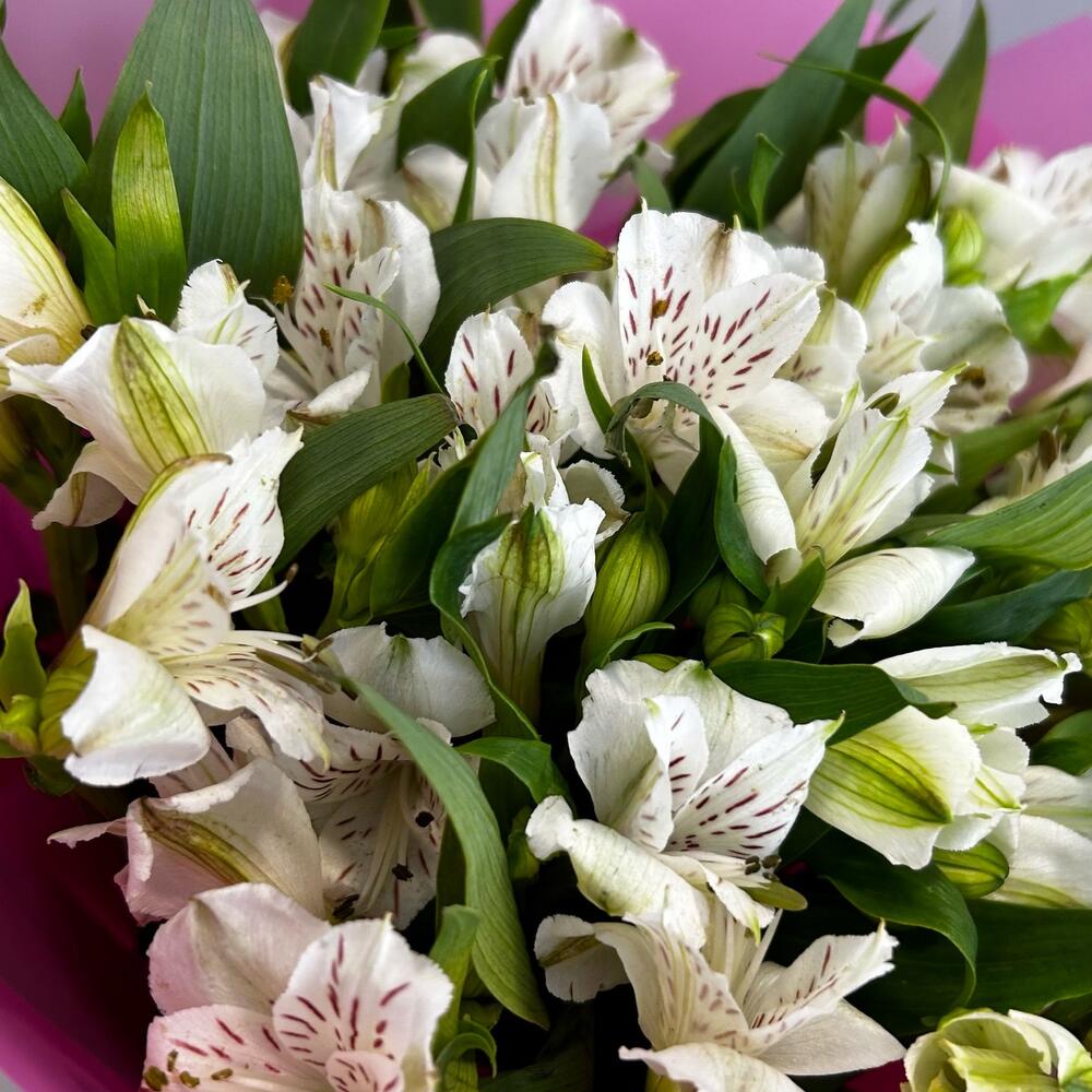 Лента атласная – 2 шт.Альстромерия – 11 шт.Упаковка дизайнерская – 2 шт.Зелень – 2 шт.