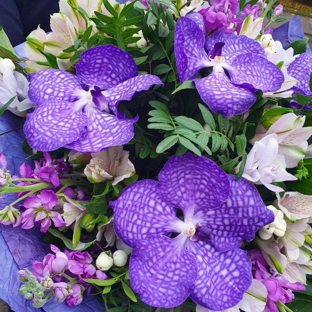Ванда орхидея – 5 шт.Альстромерия – 7 шт.Фрезия – 5 шт.Маттиола – 7 шт.Снежноягодник – 3 шт.Фисташка – 1 шт.Рускус – 1 шт.Упаковка – 2 шт.