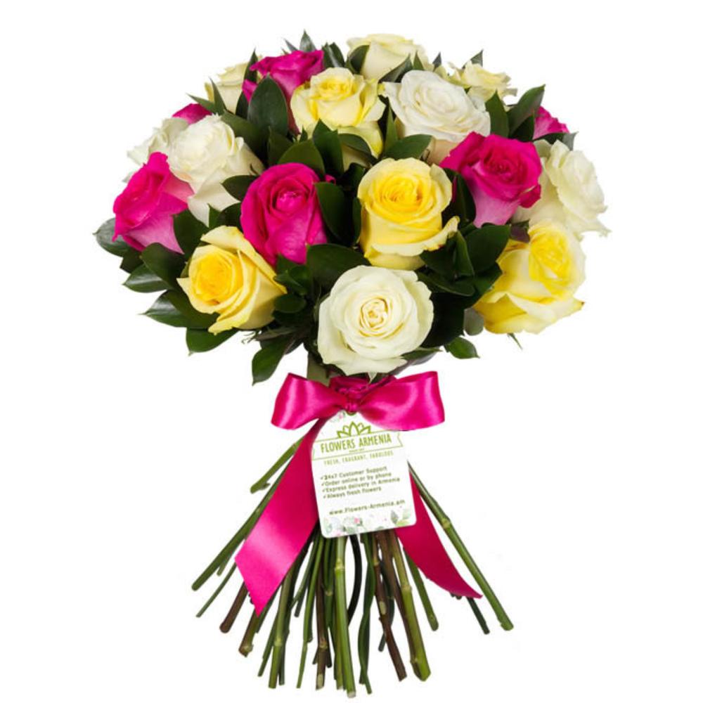 A bouquet of 21 colorful Dutch roses, ruskus leaves with a pink ribbon. The height of the stem is from 50-60 cm.