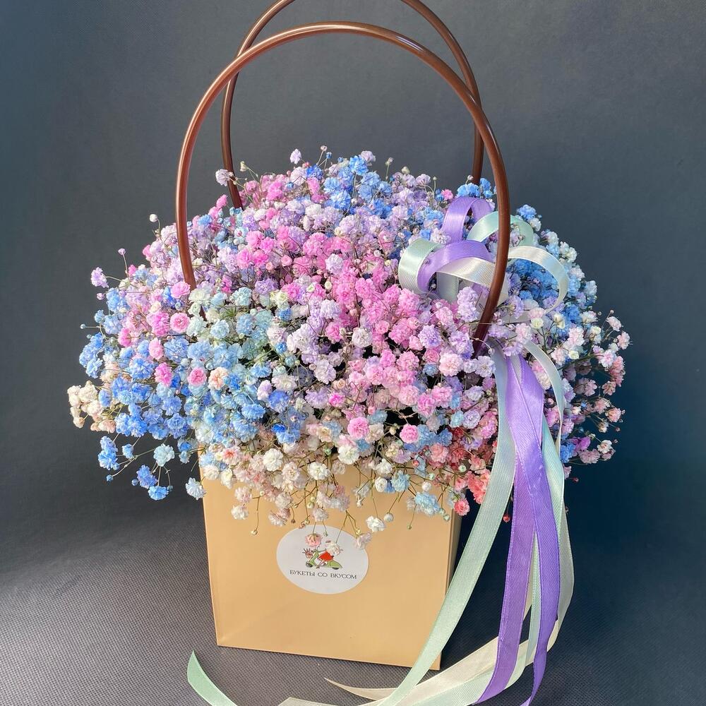 Стильная, сочная композиция из гипсофилы в сумочке станет прекрасным подарком на любой праздник или приятным сюрпризом в качестве комплимента
