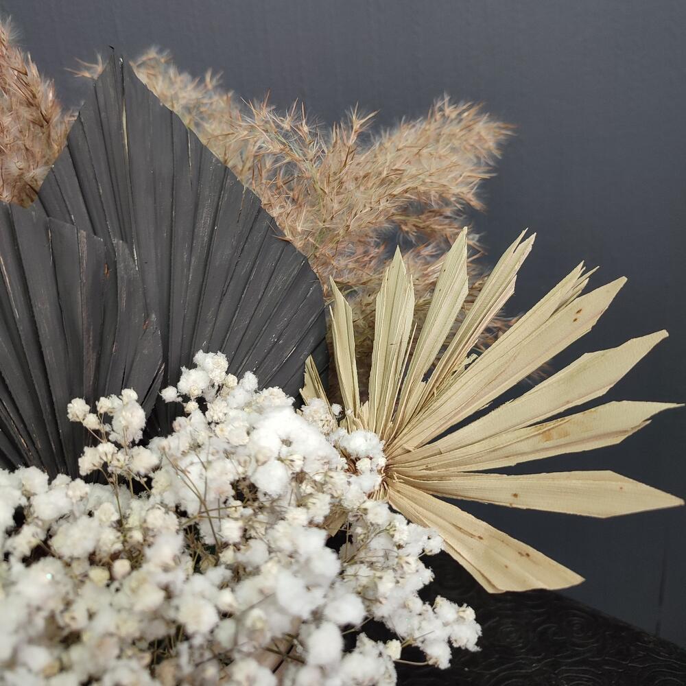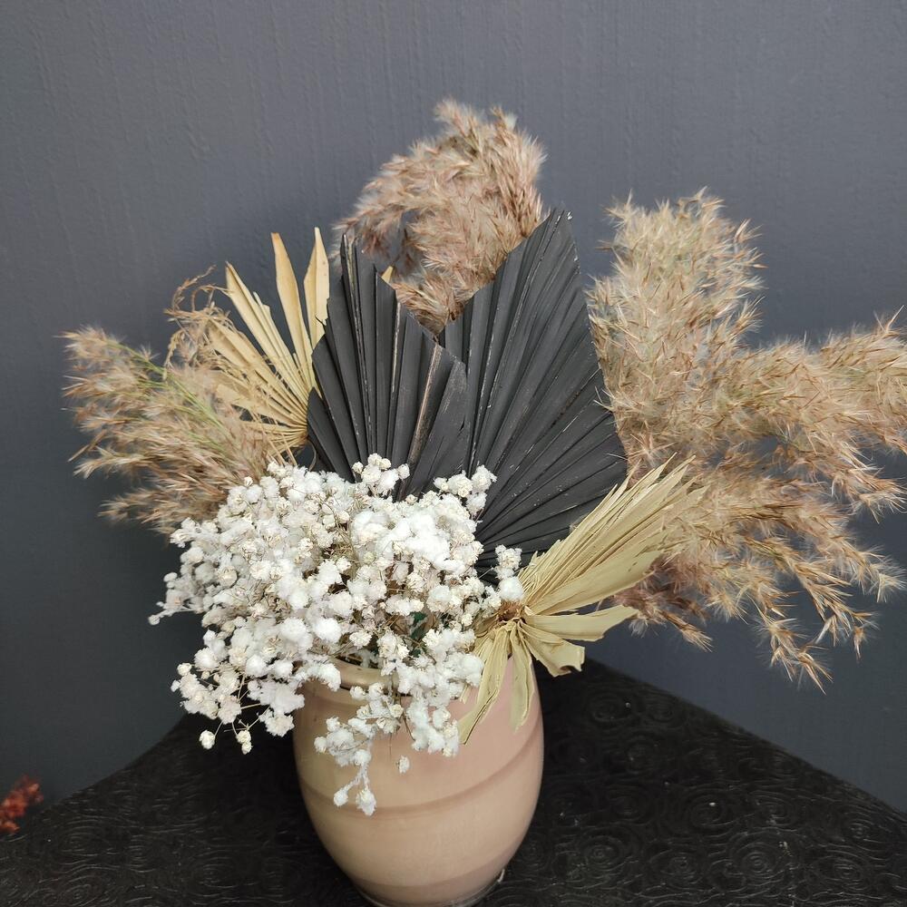 Ваза керамика – 1 шт.Оазис флористический – 1 шт.Гипсофила – 1 шт.Лист пальмы – 4 шт.камыш декоративный – 4 шт.
