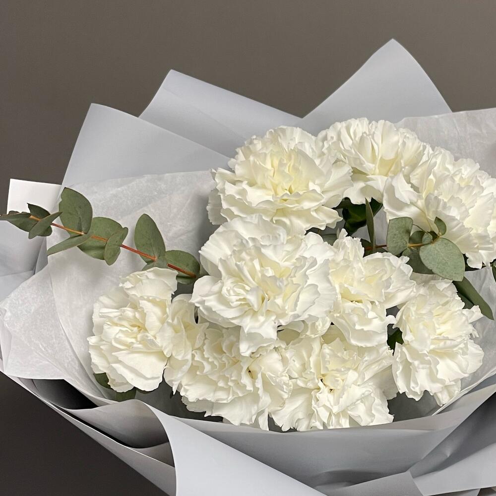Эвкалипт – 3 шт.Тишью – 2 шт.Пленка матовая – 2 шт.Диантус белый – 9 шт.