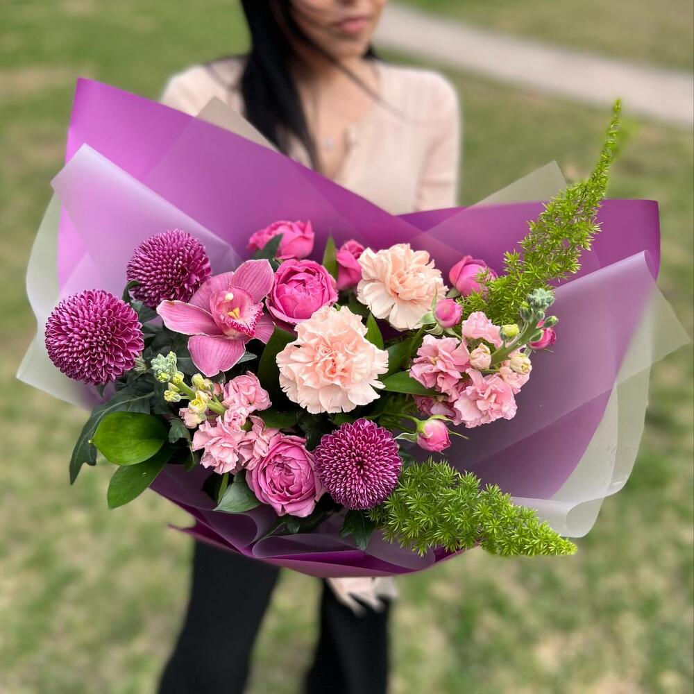 Роза кустовая пионовидная – 1 шт.Роза одноголовая пионовидная – 1 шт.Ранункулюс – 1 шт.Диантус – 1 шт.Хамелациум – 1 шт.Альстромерия – 1 шт.Эустома – 1 шт.Маттиола – 1 шт.Зелень – 1 шт.