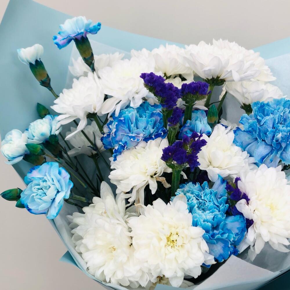 Хризантема кустовая – 3 шт.Диантус – 3 шт.Диантус кустовой – 3 шт.Статица – 1 шт.Тишью – 1 шт.Пленка матовая – 1 шт.Лента атласная – 1 шт.
