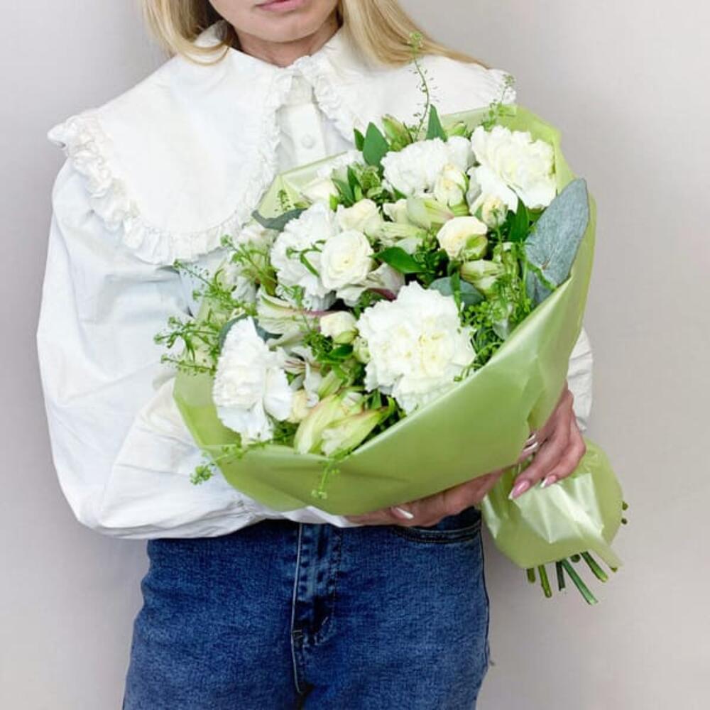 Букет из альстромерии, кустовой розы и диантуса в белых тонах