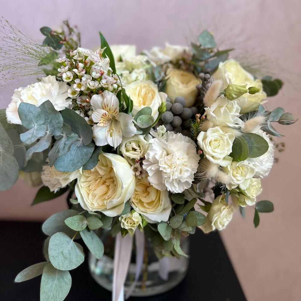 Кустовая роза – 5 шт.Пионовидная роза – 7 шт.Лизиантус (эустома) – 4 шт.Оксипеталум – 2 шт.Альстромерия – 3 шт.Диантус – 9 шт.Хамелациум – 3 шт.Бруния – 2 шт.Паникум – 3 шт.Эвкалипт – 5 шт.Атласная лента – 2 шт.