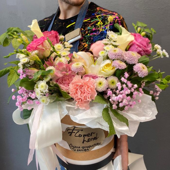 Альстромерия – 2 шт.Гипсофила – 1 шт.Хлопок – 2 шт.Зелень – 5 шт.Диантус – 1 шт.Сантини – 5 шт.каалы – 4 шт.розы микс – 6 шт.