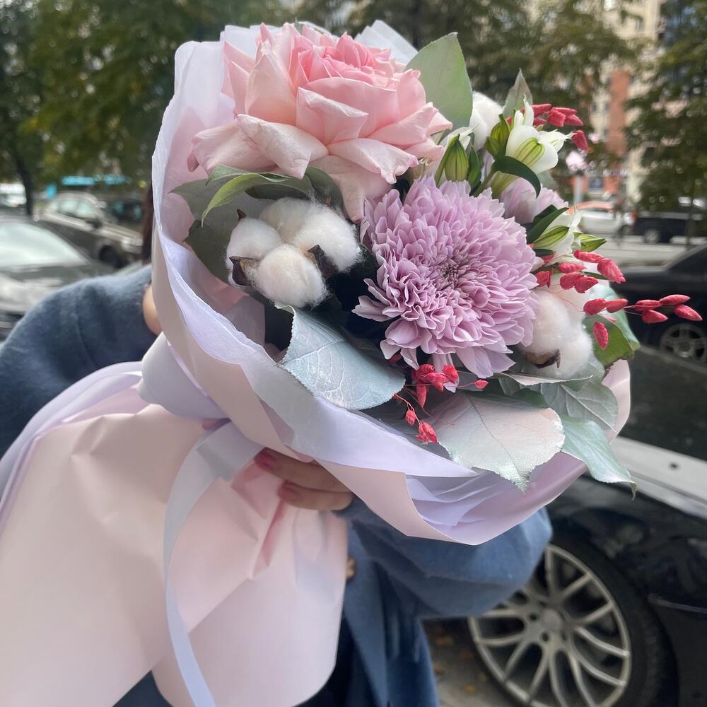 Альстромерия – 1 шт.Папоротник – 1 шт.Хлопок – 3 шт.Хризантема – 2 шт.Лента атласная – 2 шт.Пленка – 2 шт.Сухоцветы – 3 шт.Салал пучок – 1 шт.Охара – 1 шт.тишь – 2 шт.