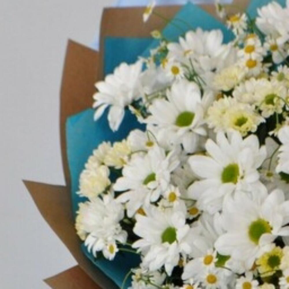 Хризантема кустовая – 5 шт.Танацетум – 5 шт.Сантини – 5 шт.Упаковка дизайнерская – 3 шт.