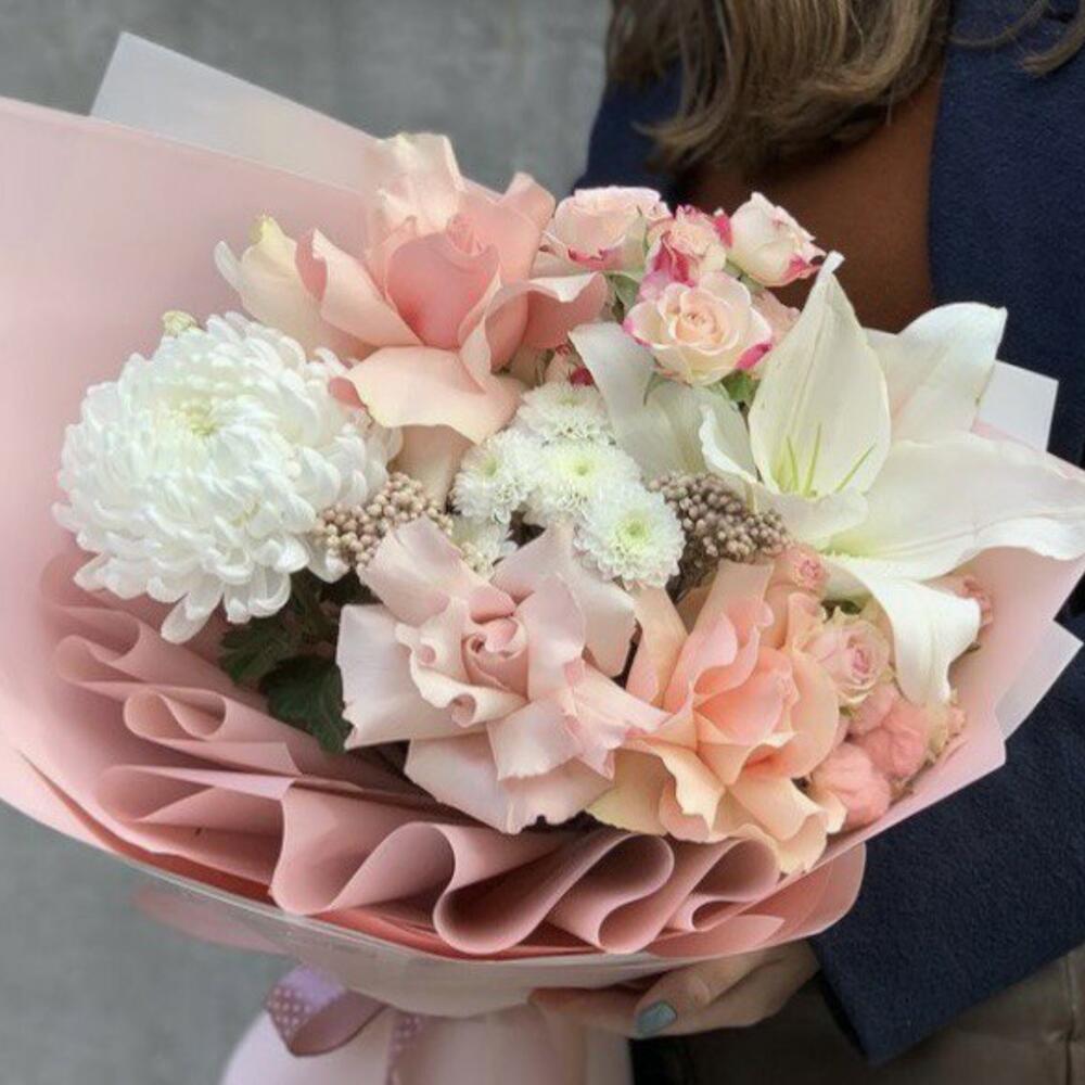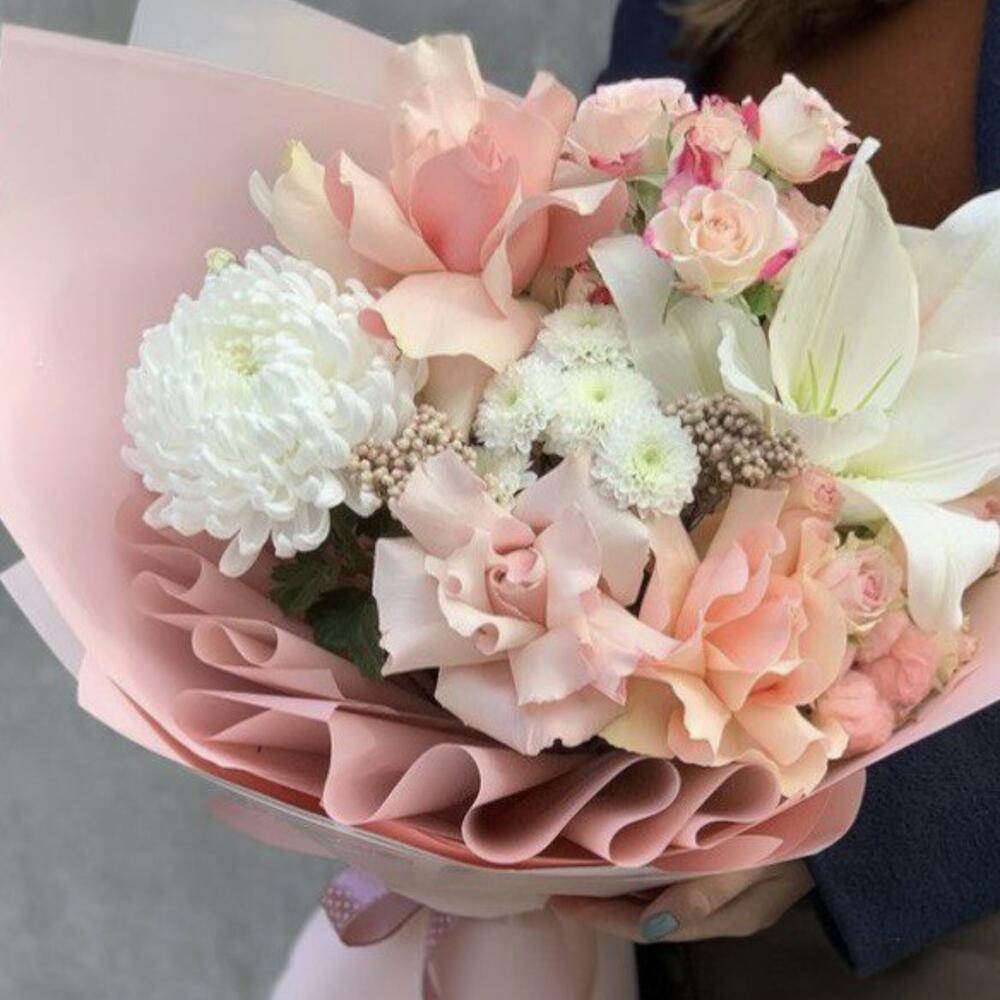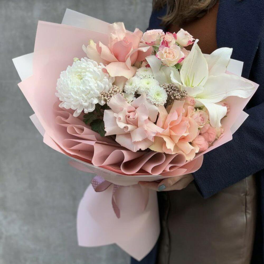 Альстромерии, Гвоздики, Кустовые розы, Лизиантусы, Розы, Хризантемы