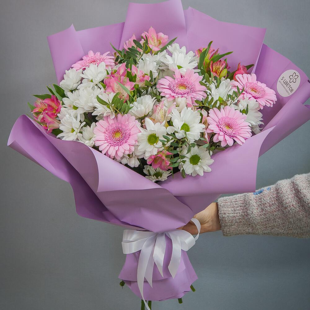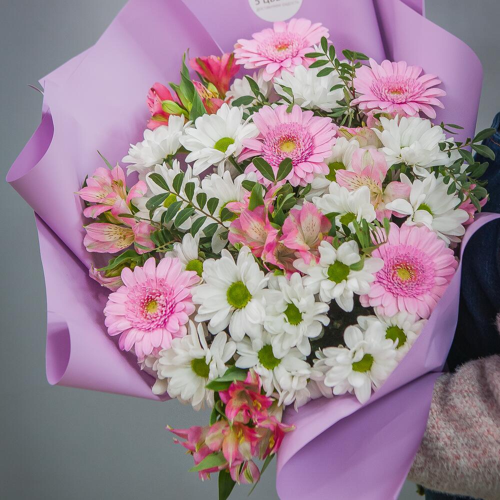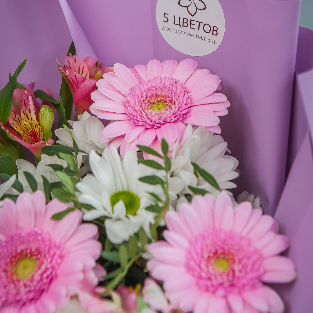 Хризантема – 5 шт.Альстромерия розовая – 7 шт.Гербера розовая – 5 шт.Фисташка – 3 шт.