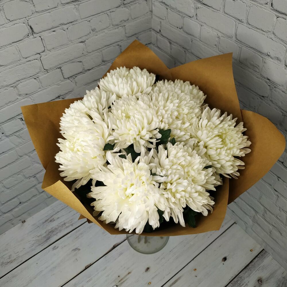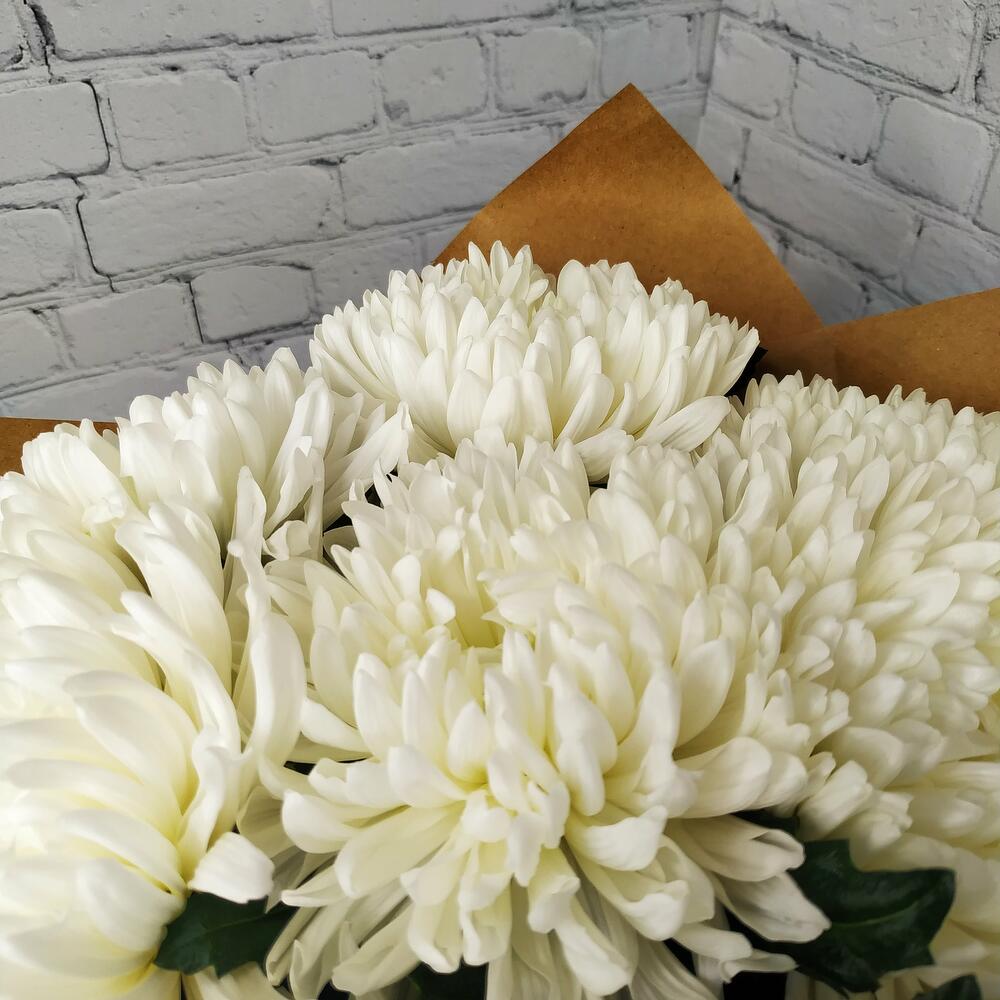 Прекрасный букет из белых хризантем, станет идеальным подарком для самых любимых и близких!Памятка для букета:1. Чистая вода раз в сутки.2. Стебли подрезаем на 0,5см при каждой смене воды.3. Ставим в прохладное место, но не у окна.4. Чтобы вода оставалась свежей, не допускайте попадания листьев и лепестков в воду.Друзья, обратите внимание, что цвет упаковки может быть другим, в зависимости от наличия на складе.