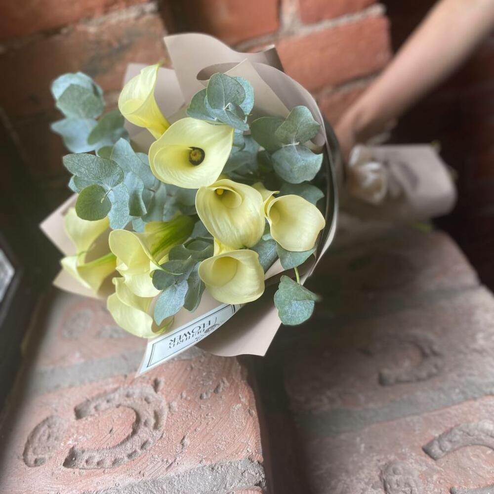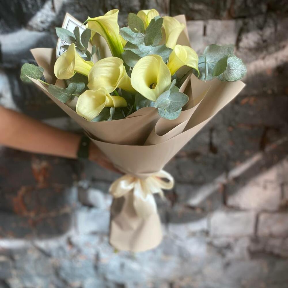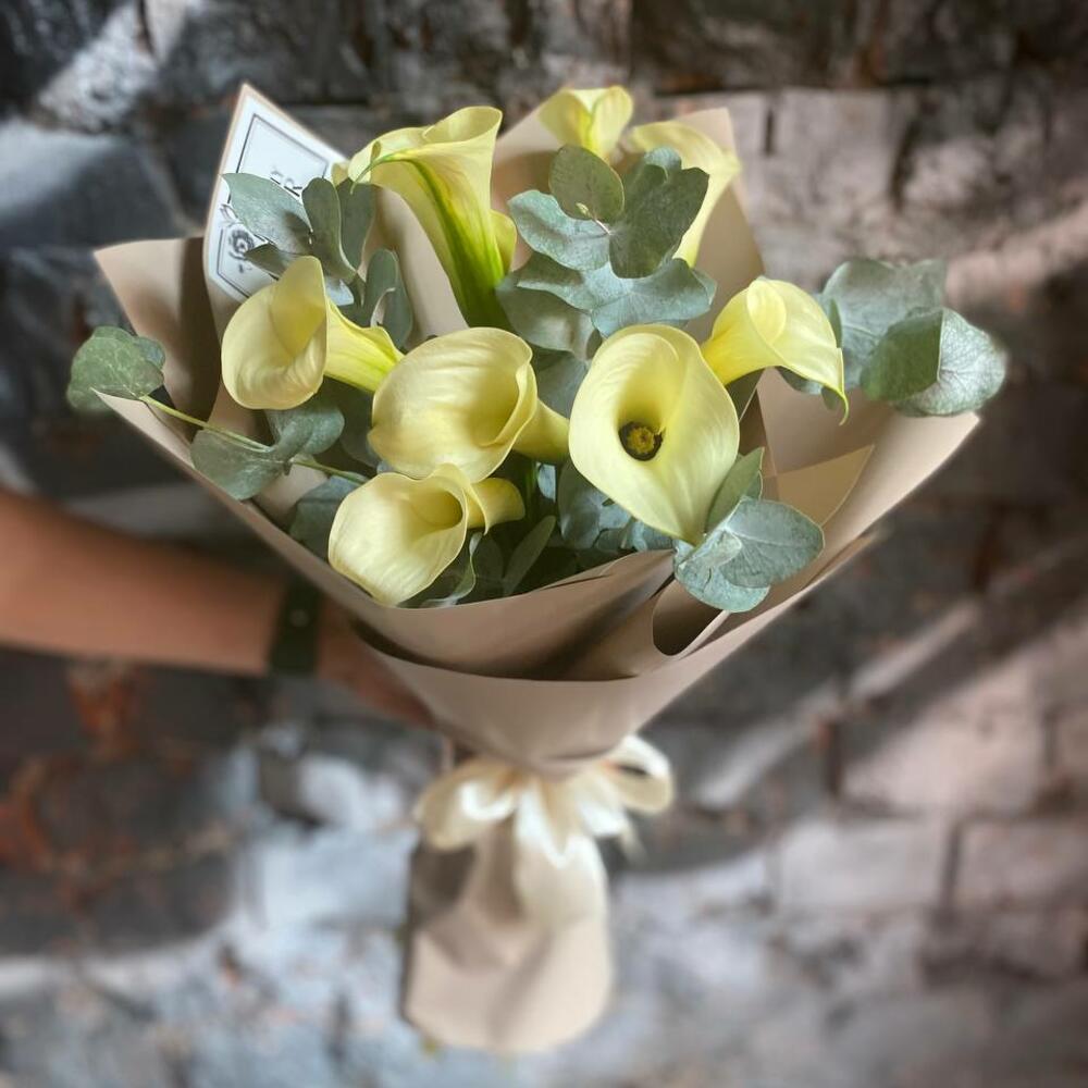 Букет из 9 белых калл с эвкалиптом в упаковке “Весенний туман”