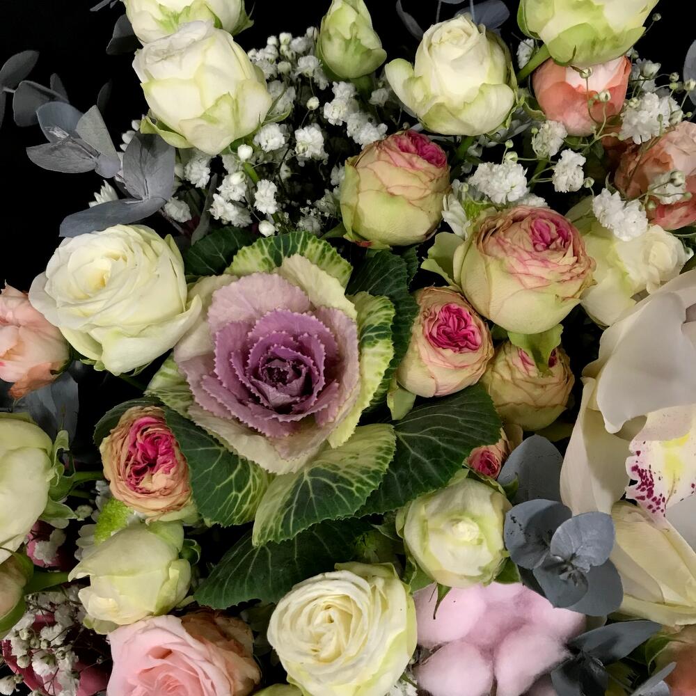 Альстромерии, Гвоздики, Кустовые розы, Лизиантусы, Розы, Хризантемы
