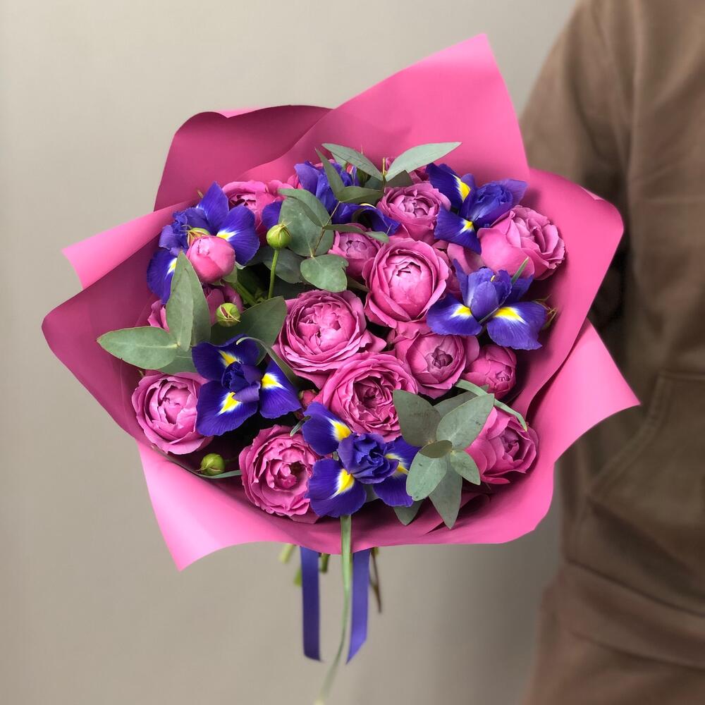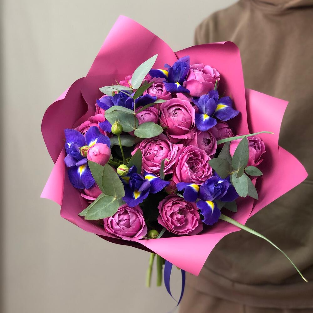 Авторский букет с ирисами и пионовидными розами