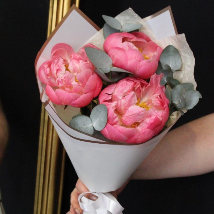 3 коралловых пиона с эвкалиптом