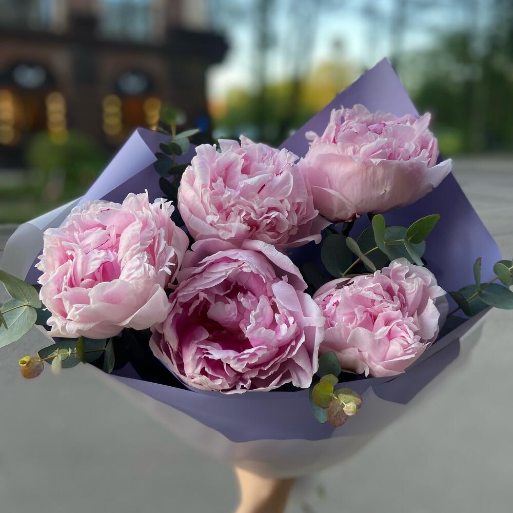 Пион – 5 шт.Эвкалипт – 5 шт.Упаковка дизайнерская – 1 шт.