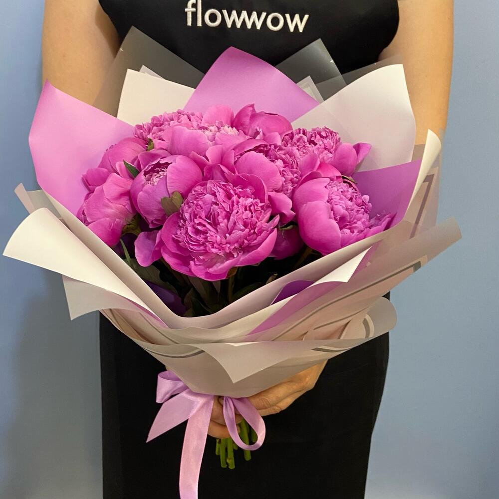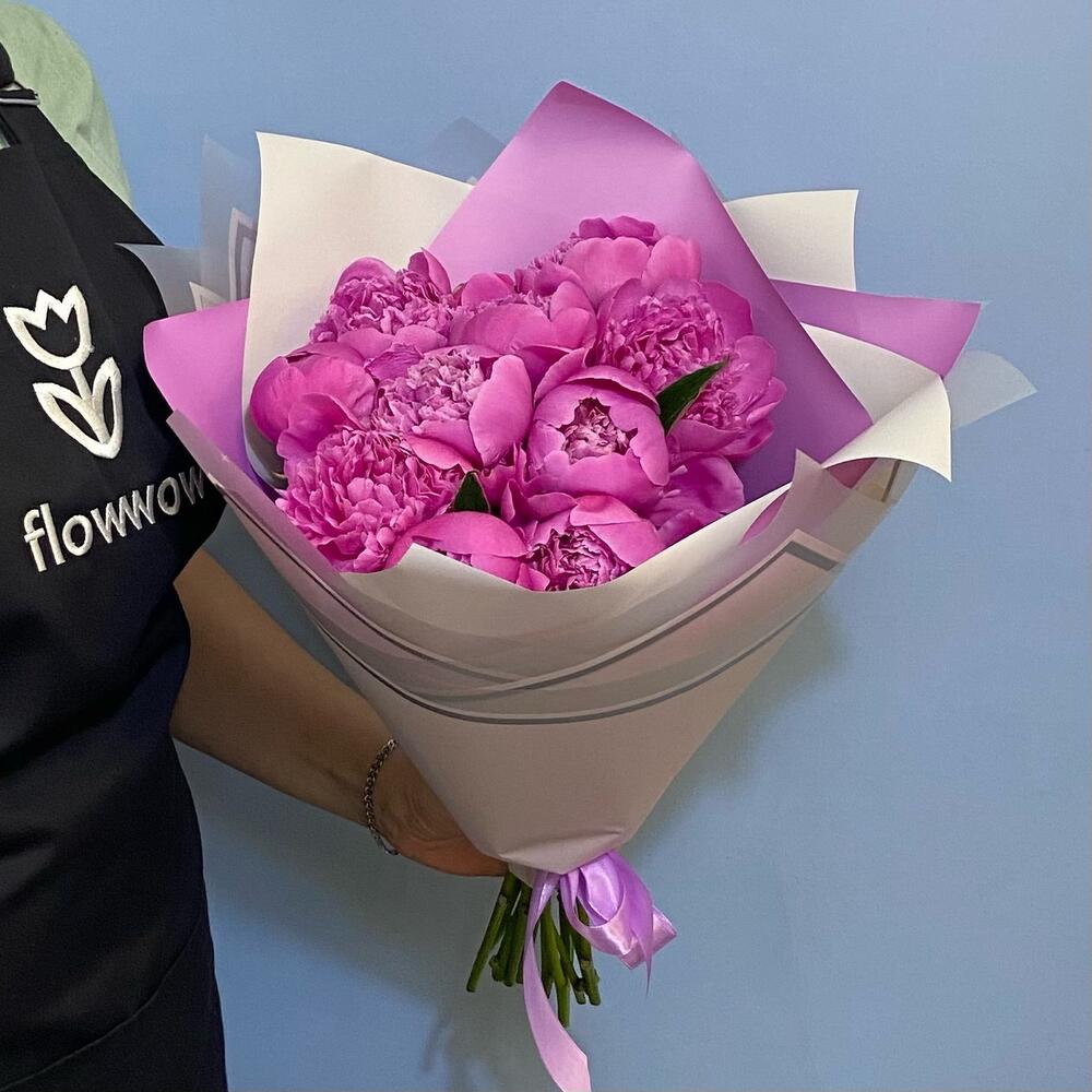 Лента атласная – 1 шт.Упаковка дизайнерская – 2 шт.ярко розовые пионы – 11 шт.