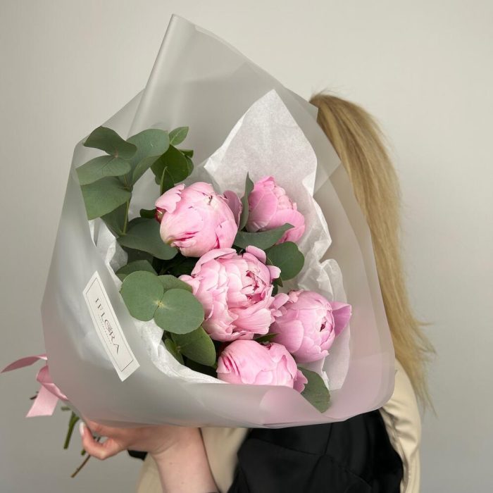 Нежно-розовые пионы 5 шт с эвкалиптом в дизайнерской упаковке – отличный комплимент любой девушкеК букету в качестве подарка подкрепим кризал, инструкцию по уходу за цветами и шоколадку!
