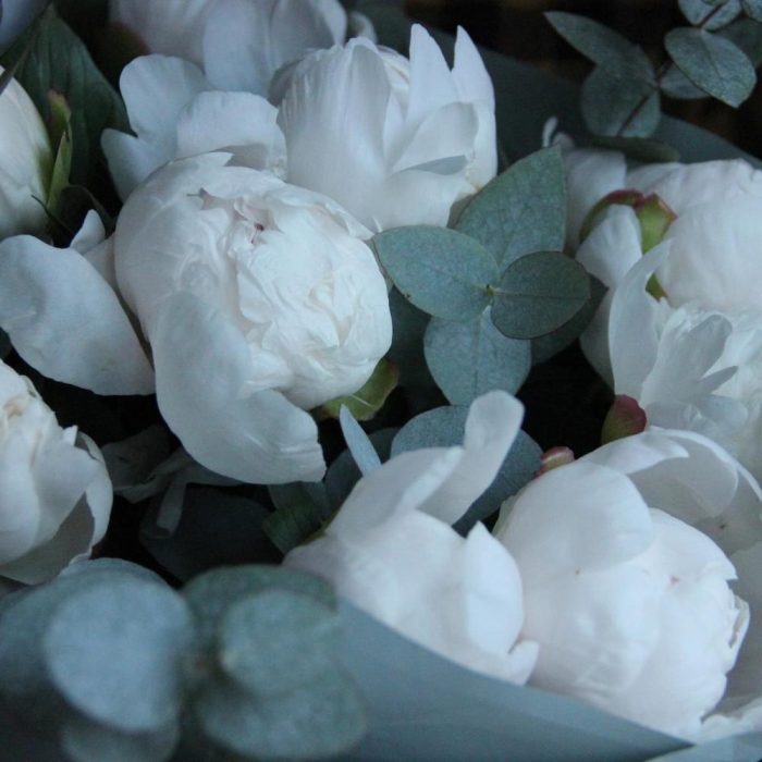 Моно букет из девяти белых пионов, с веточками эвкалипта, в лаконичной упаковке.Стильное цветочное решение для любого случая.
