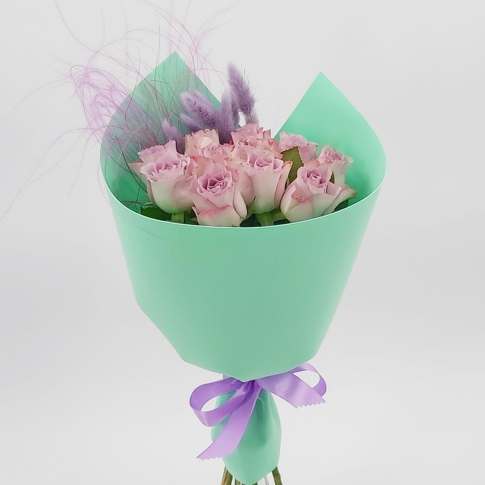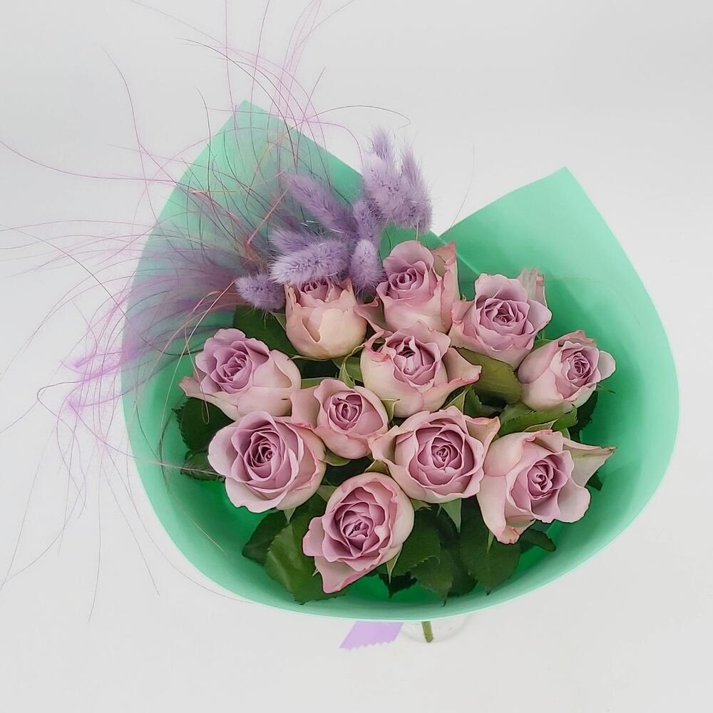 Лента атласная – 1 шт.Лагурус – 9 шт.Упаковка фоамиран – 1 шт.Роза мемори лэйн – 11 шт.стифа пучок – 1 шт.
