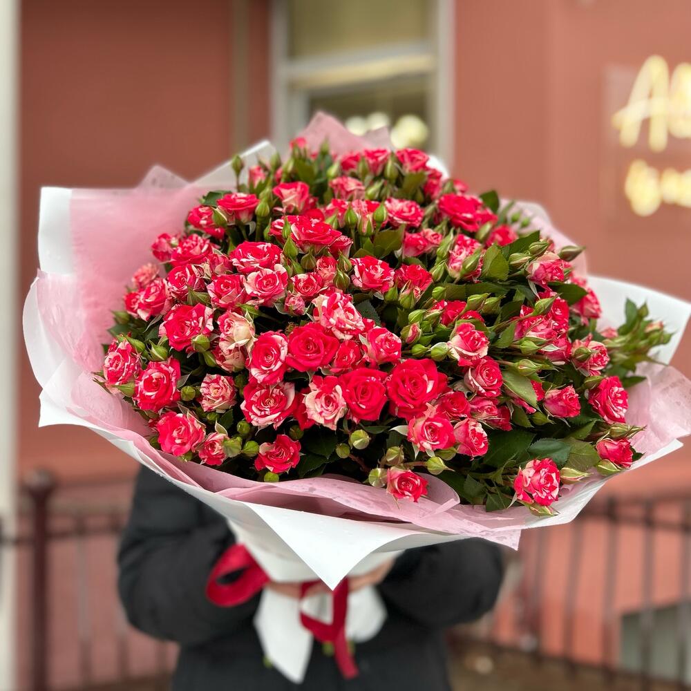 Букет из 15 веток кустовых роз сорта фаерворкс с оформлением, количество бутонов(розочек) в букете может достигать 101 штуки .