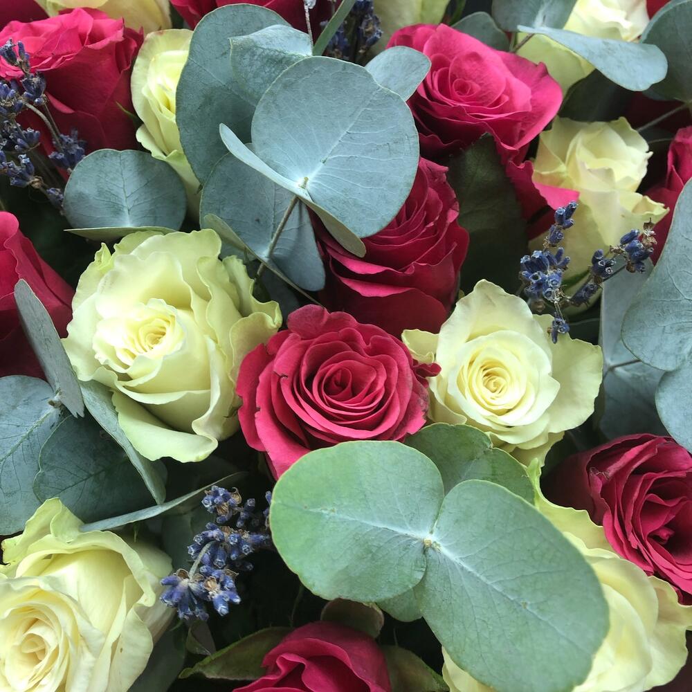 19 роз с эвкалиптом и лавандой