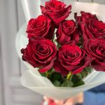Роза красная Эквадор – 9 шт.Упаковка дизайнерская – 2 шт.Лента атласная – 2 шт.