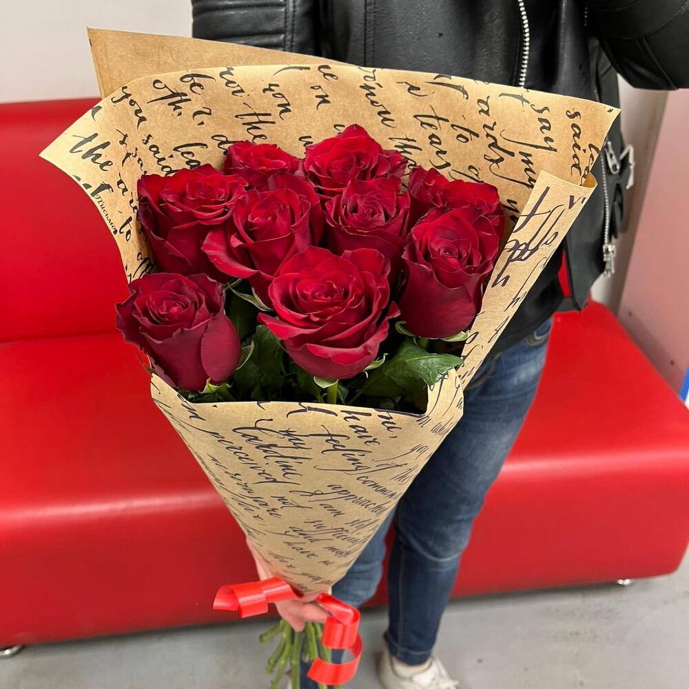 розы эквадор (60 см) – 9 шт.Крафт – 1 шт.Лента атласная – 1 шт.