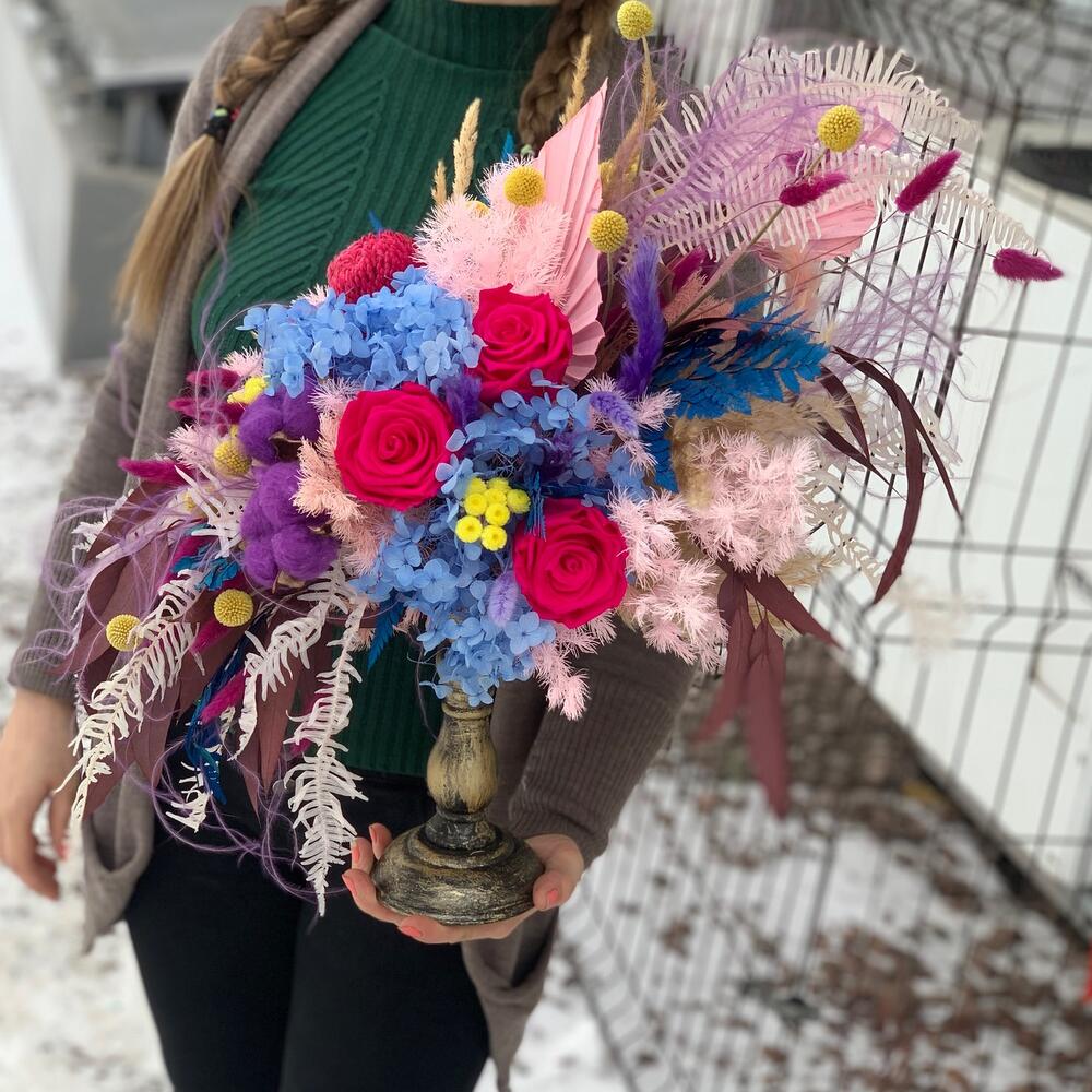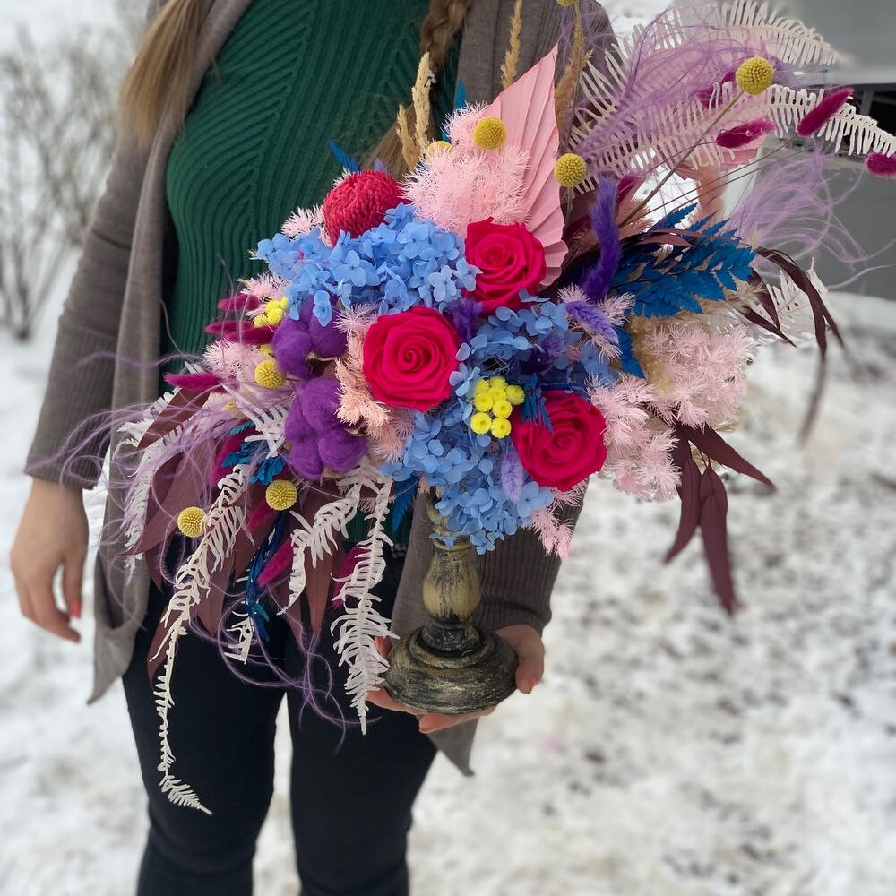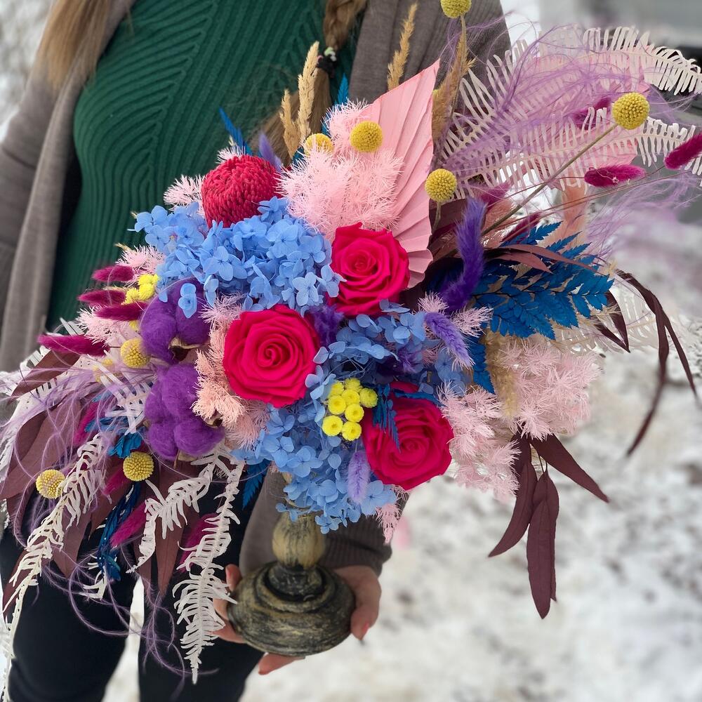 Сухоцветы – 230 шт.Роза стабилизированная – 5 шт.Банксия – 1 шт.умбрелла – 3 шт.
