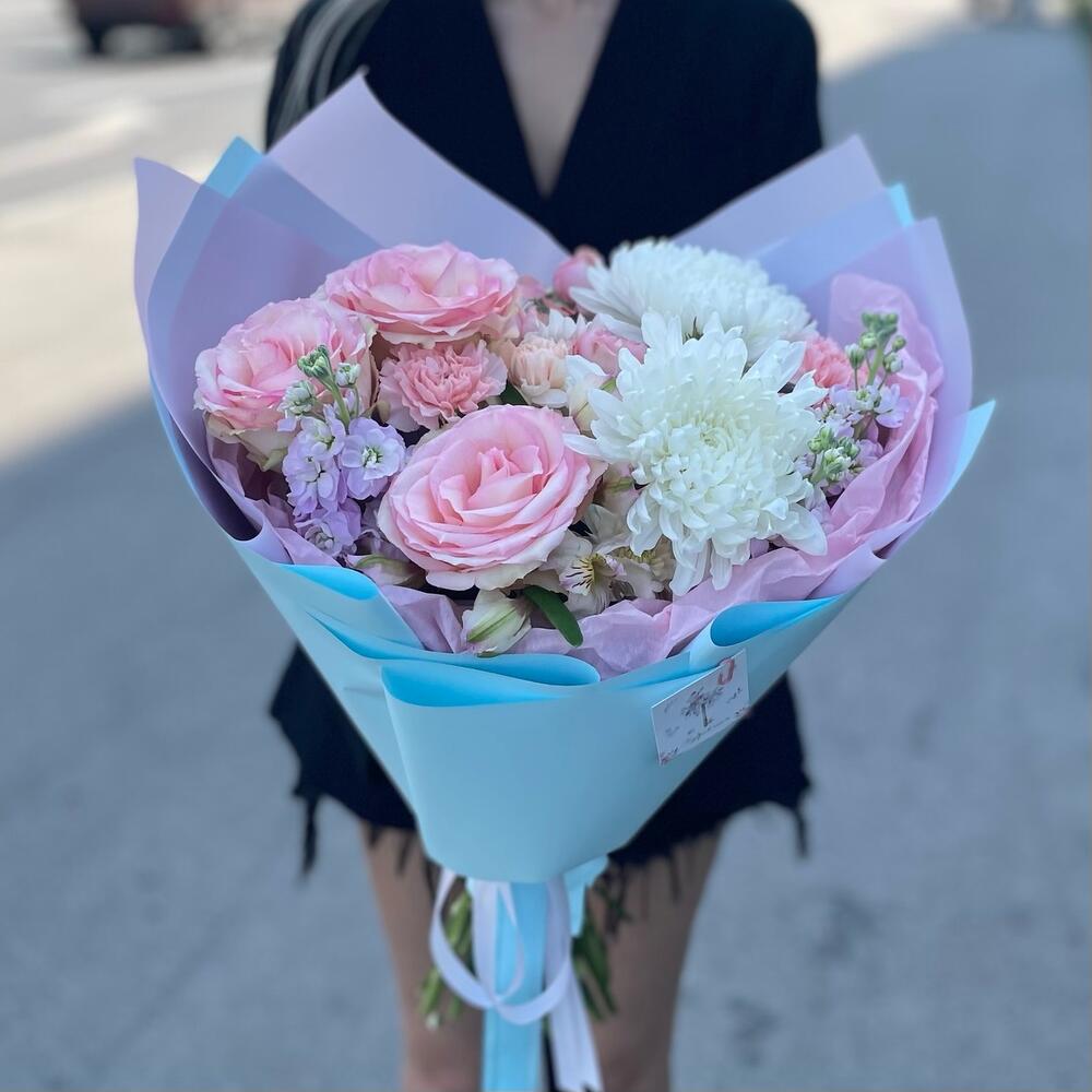 Альстромерия – 2 шт.Маттиола – 3 шт.Роза кустовая – 1 шт.Хризантема кустовая – 2 шт.Роза – 3 шт.Зелень – 3 шт.Хризантема – 2 шт.Гвоздика – 7 шт.Упаковка дизайнерская – 1 шт.