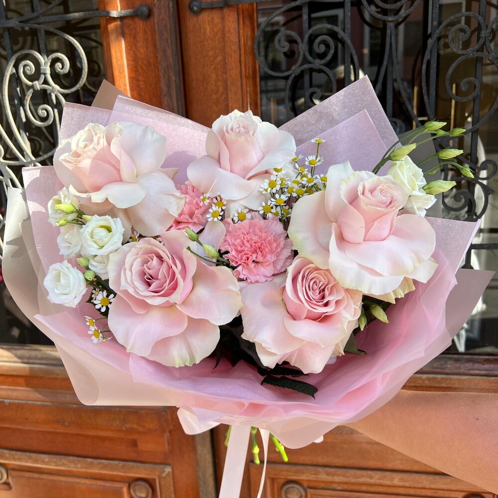Категории: Гвоздики, Лизиантусы, Розы, Ромашки