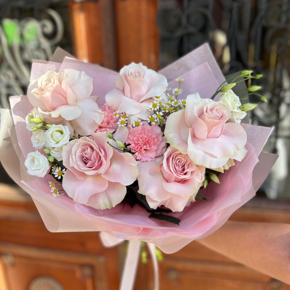 Лизиантус – 1 шт.Ромашка – 2 шт.Гвоздика – 2 шт.Фисташка – 1 шт.Французская роза – 5 шт.Открыточка с вашими пожеланиями – 1 шт.Шоколадка – 1 шт.Дизайнерская упаковка – 1 шт.