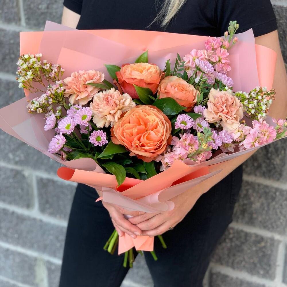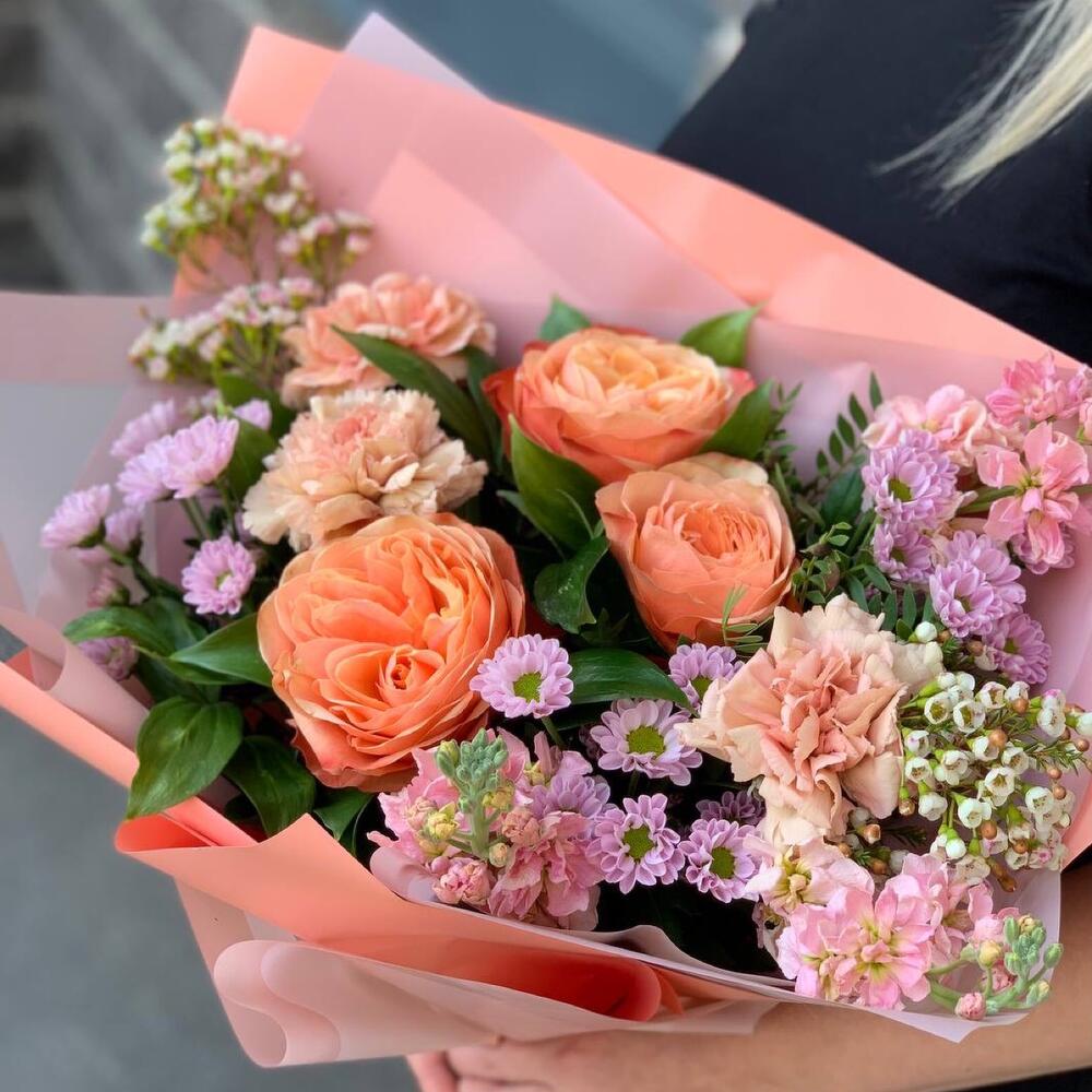 Роза пионовидная – 3 шт.Диантус – 3 шт.Сантини – 3 шт.Ваксфлауэр – 2 шт.Маттиола – 3 шт.Фисташка – 2 шт.Зелень – 10 шт.Упаковка дизайнерская – 1 шт.Лента атласная – 1 шт.