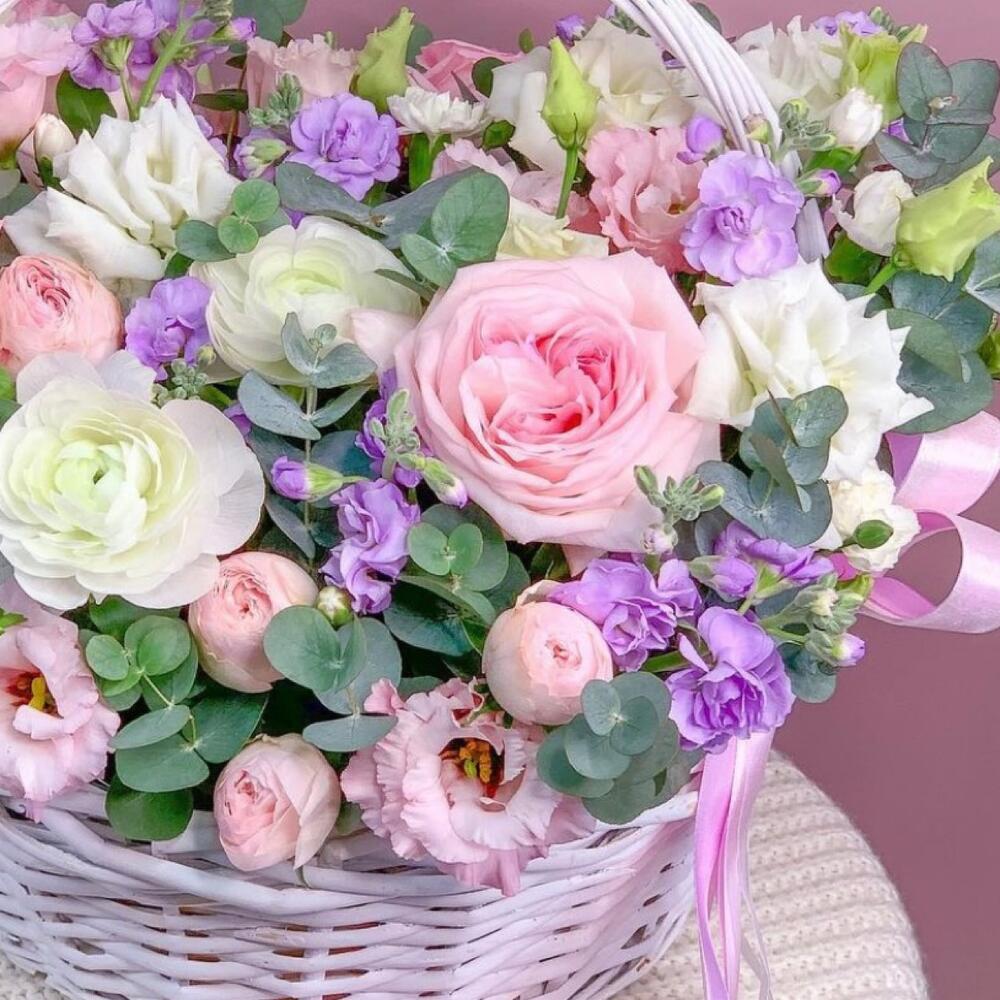 Маттиола – 3 шт.Эвкалипт – 3 шт.Диантус – 3 шт.Ранункулюс – 1 шт.Роза садовая – 3 шт.Корзина плетеная – 1 шт.эустома розовая – 4 шт.Кустовая роза пионовидная – 2 шт.