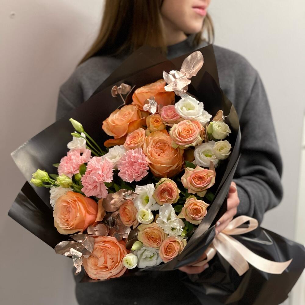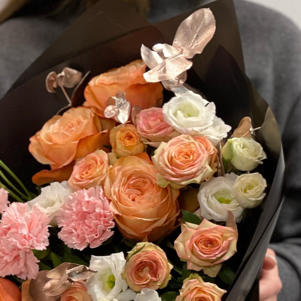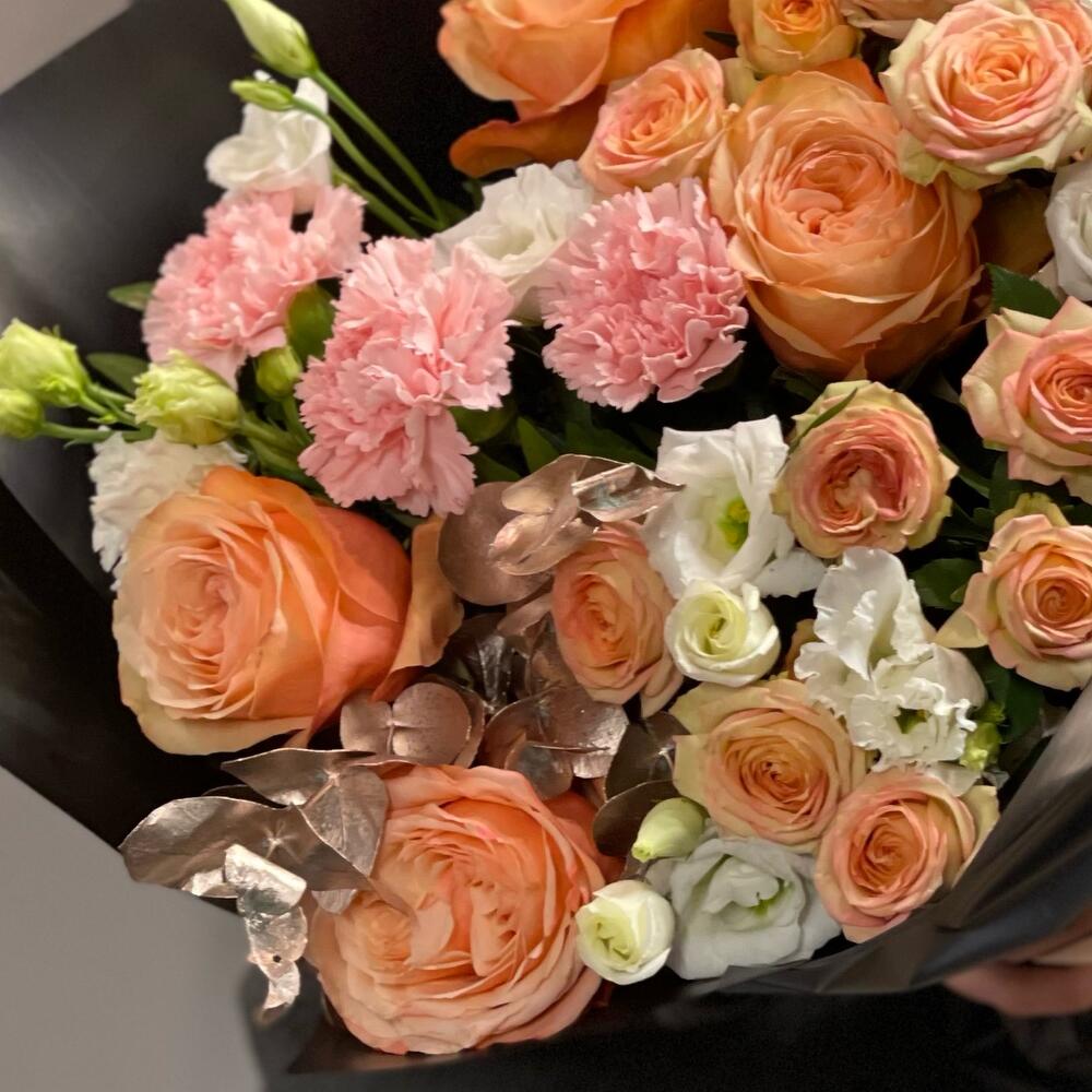 Гвоздики, Лизиантусы, Розы, Тюльпаны
