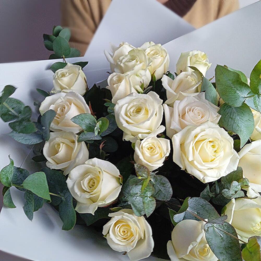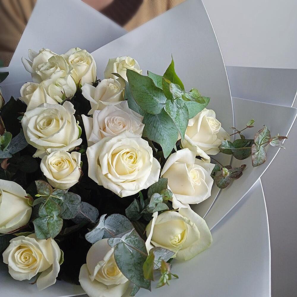 Букет из белых роз и эвкалипта