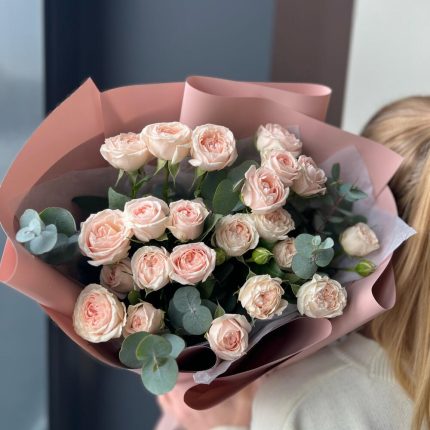 Букет из кустовой пионовидной розы Джульетта и эвкалипт