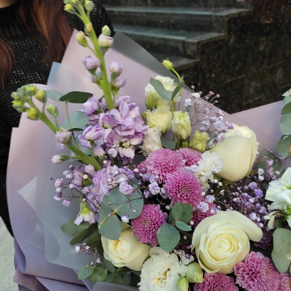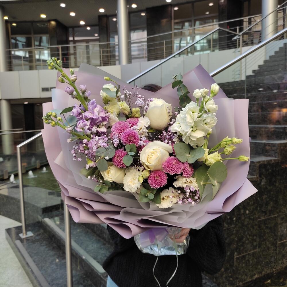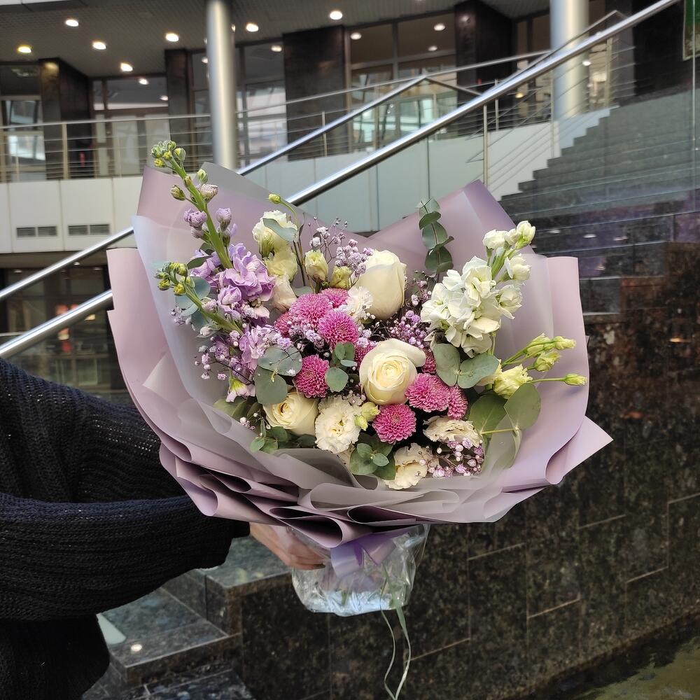 Маттиола – 3 шт.Хризантема кустовая – 2 шт.Лизиантус – 2 шт.Роза – 1 шт.Гипсофила – 1 шт.Эвкалипт – 1 шт.Лента – 2 шт.Упаковка дизайнерская – 2 шт.