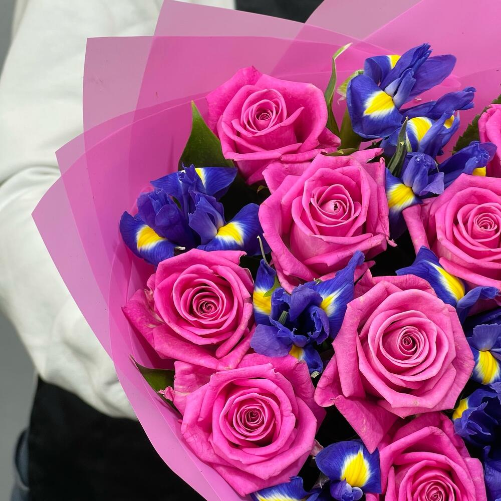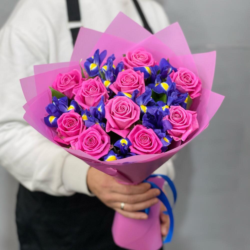 аква роза – 10 шт.Ирис – 9 шт.Рускус – 10 шт.Упаковка дизайнерская – 3 шт.Лента атласная – 1 шт.