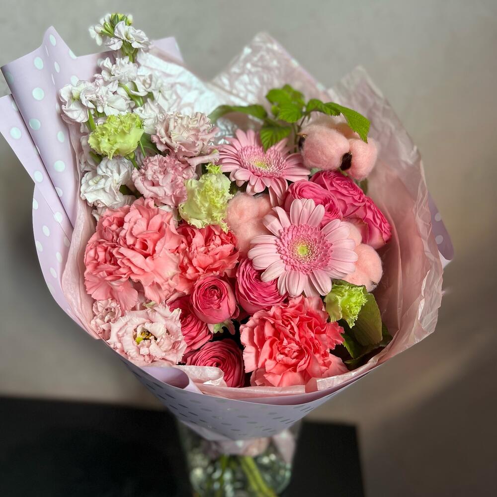 Кустовая роза – 3 шт.Маттиола – 2 шт.Гербера – 2 шт.Лизиантус – 2 шт.Гвоздика – 3 шт.Хлопок – 3 шт.декоративная упаковка – 1 шт.Атласная лента – 1 шт.