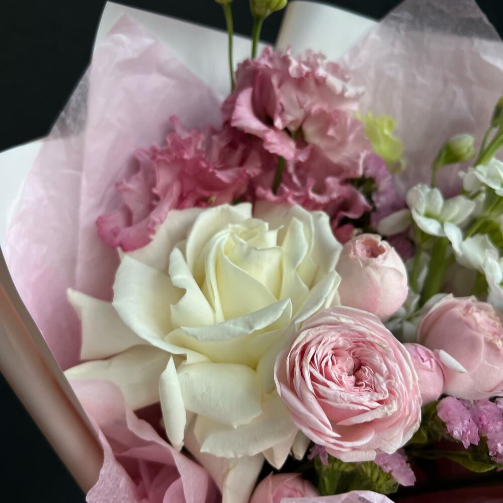 Маттиола – 1 шт.Статица – 1 шт.Атласная лента – 1 шт.Кустовая пионовидная роза – 1 шт.Одноголовая роза – 1 шт.декоративная упаковка – 1 шт.
