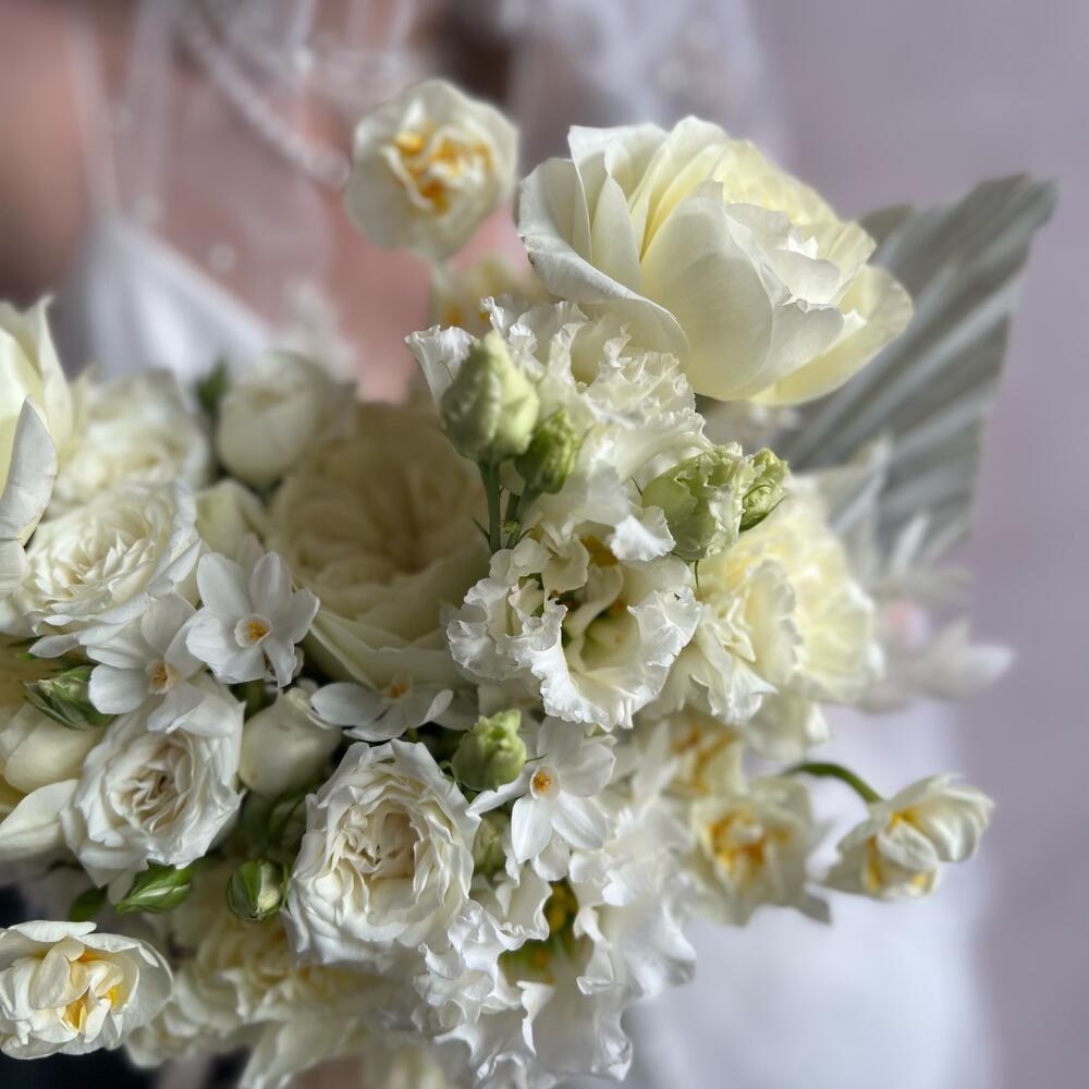 Лизиантус – 3 шт.Нарцисс – 9 шт.Диантус – 5 шт.Пионовидная роза – 5 шт.Атласная лента – 1 шт.Кустовая пионовидная роза – 5 шт.пальмовое копье – 1 шт.