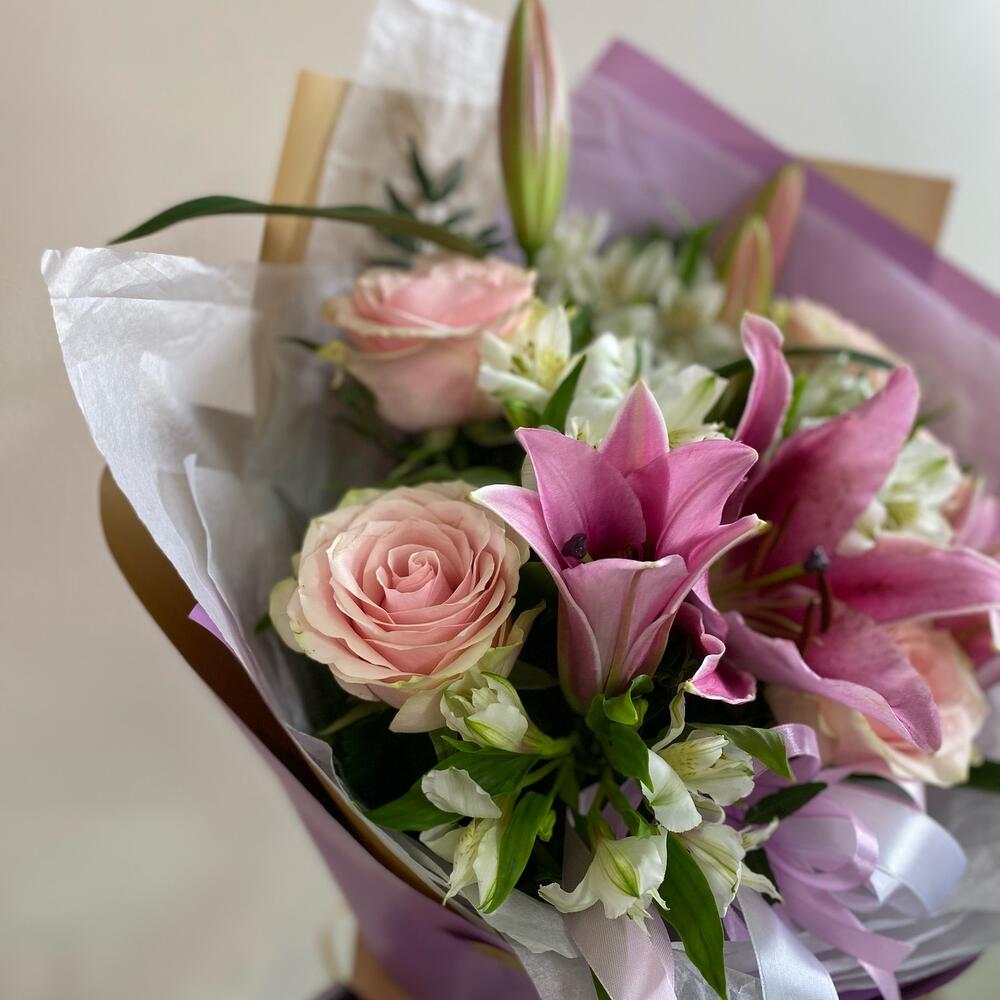 Альстромерия – 5 шт.Роза – 5 шт.Упаковка – 5 шт.Тишью белое – 6 шт.фисташка зелень – 9 шт.ленты атласные – 8 шт.лилия ароматная ветка – 2 шт.