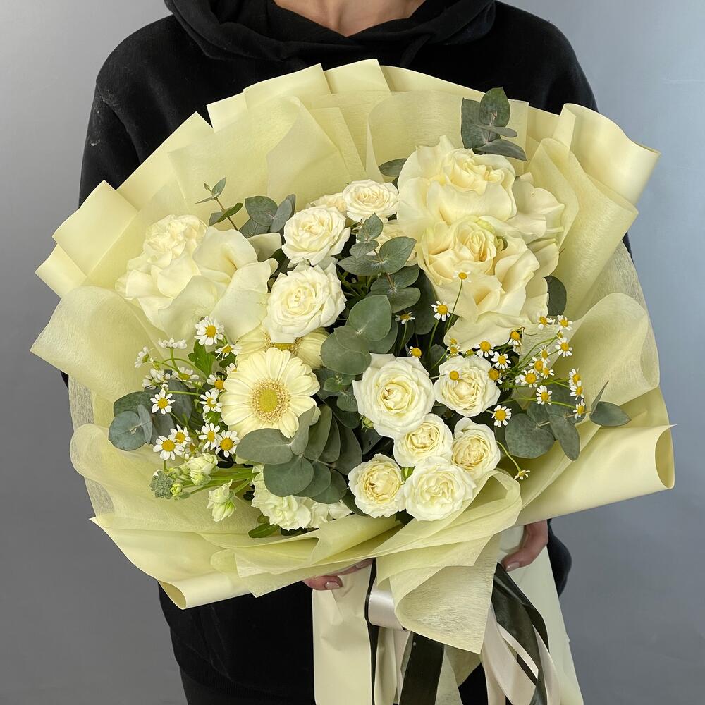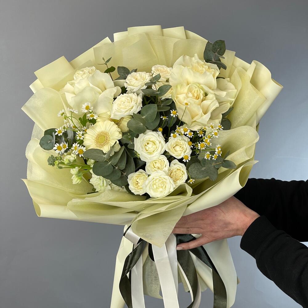 Маттиола – 1 шт.Эвкалипт – 2 шт.Роза – 3 шт.Кустовая роза – 2 шт.Лента атласная – 2 шт.Гербера – 2 шт.Матрикария – 2 шт.Фисташка – 3 шт.Упаковка дизайнерская – 2 шт.