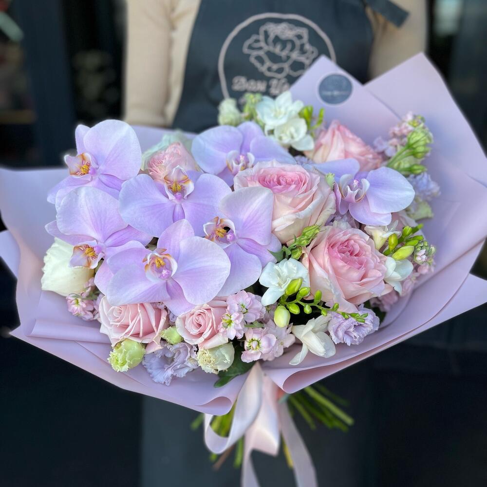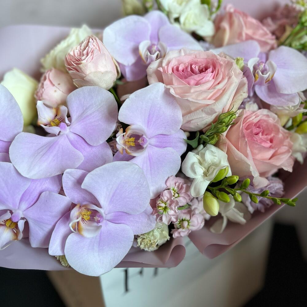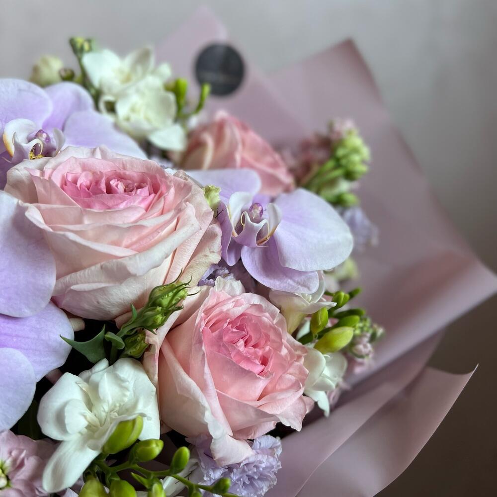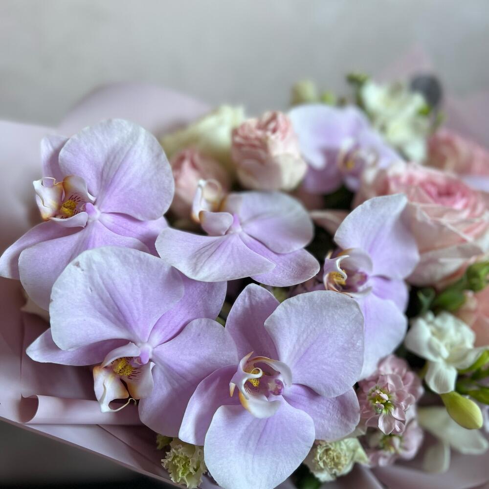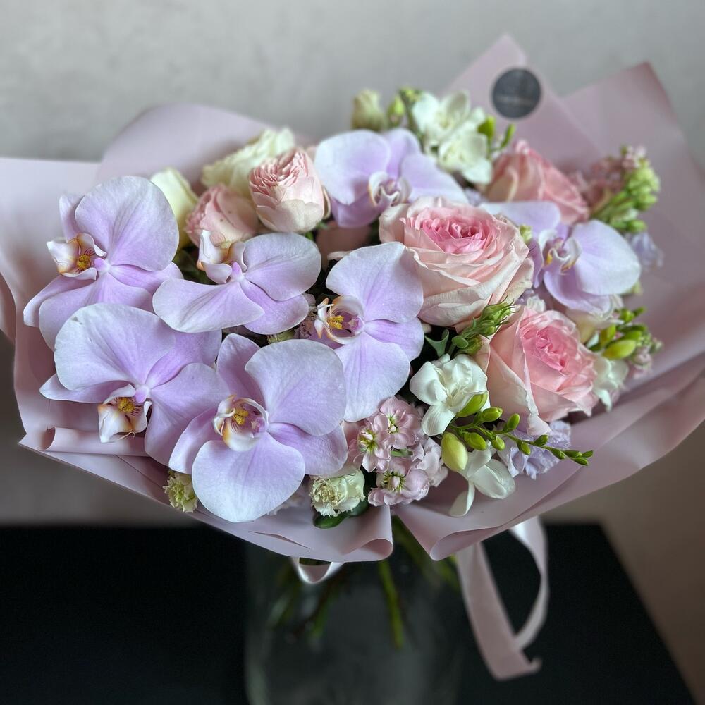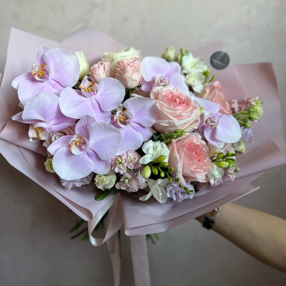 Фаленопсис – 7 шт.Маттиола – 5 шт.Лизиантус (эустома) – 2 шт.Пионовидная роза – 3 шт.одноголовая роза белая – 3 шт.Пионовидная кустовая роза – 1 шт.одноголовая роза розовая – 3 шт.декоративная упаковка – 1 шт.Атласная лента – 1 шт.