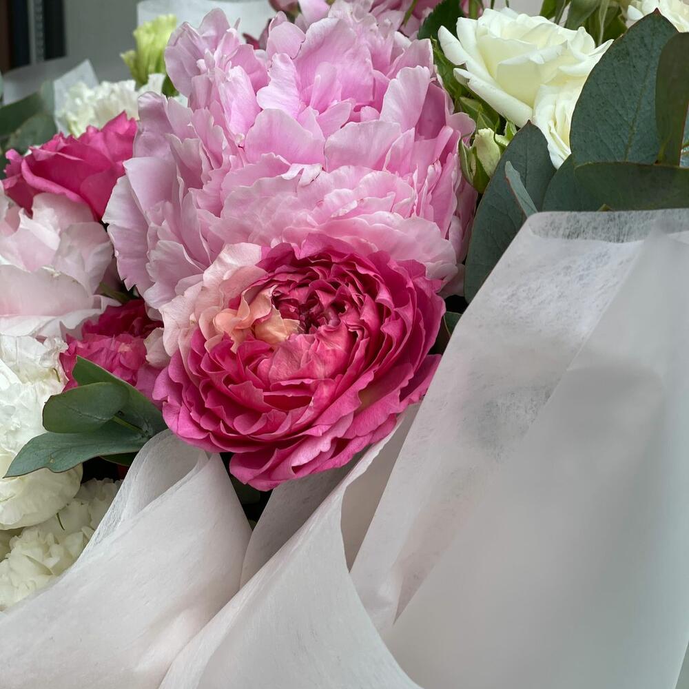 Пион – 3 шт.Лента атласная – 1 шт.Фисташка – 1 шт.Упаковка дизайнерская – 1 шт.Лизиантус Алиса белый – 1 шт.джульетта роза пионовидная – 2 шт.оксипеталлум – 2 шт.иксия – 3 шт.Эвкалипт – 1 шт.жанин роза кустовая – 1 шт.