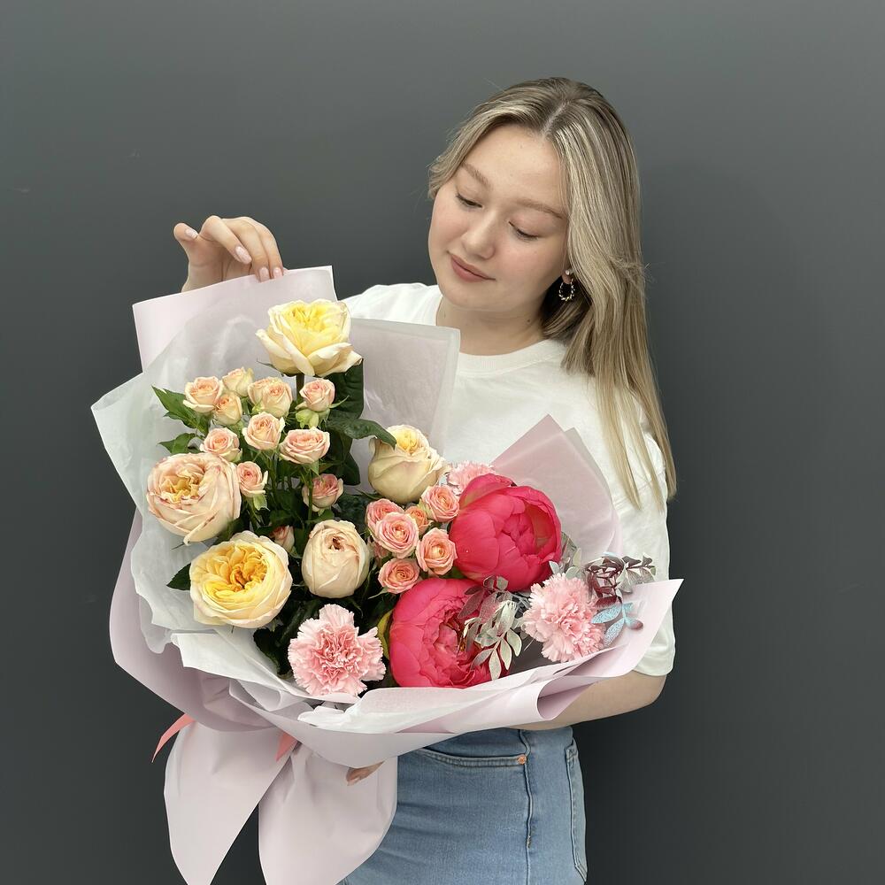 Гвоздики, Кустовые розы, Пионовидные розы, Розы