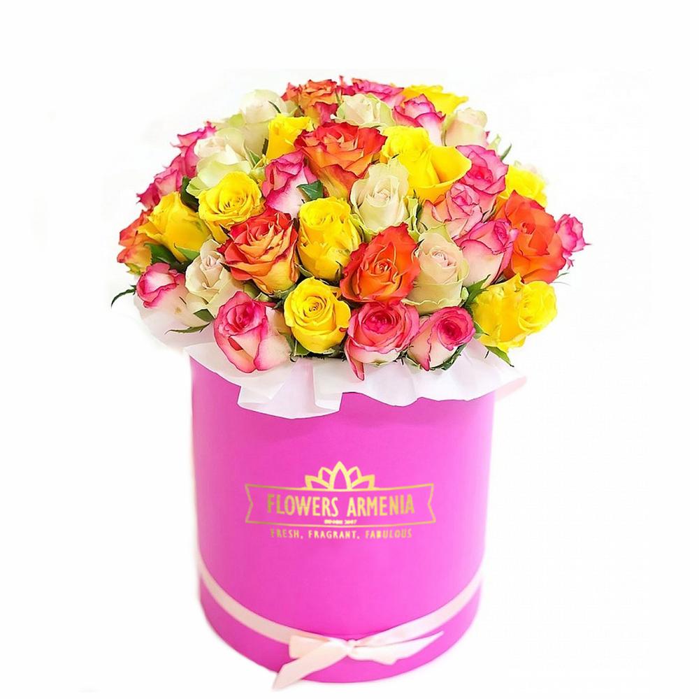 77 white, yellow, orange, red roses in a box. The size is 30×35 cm.